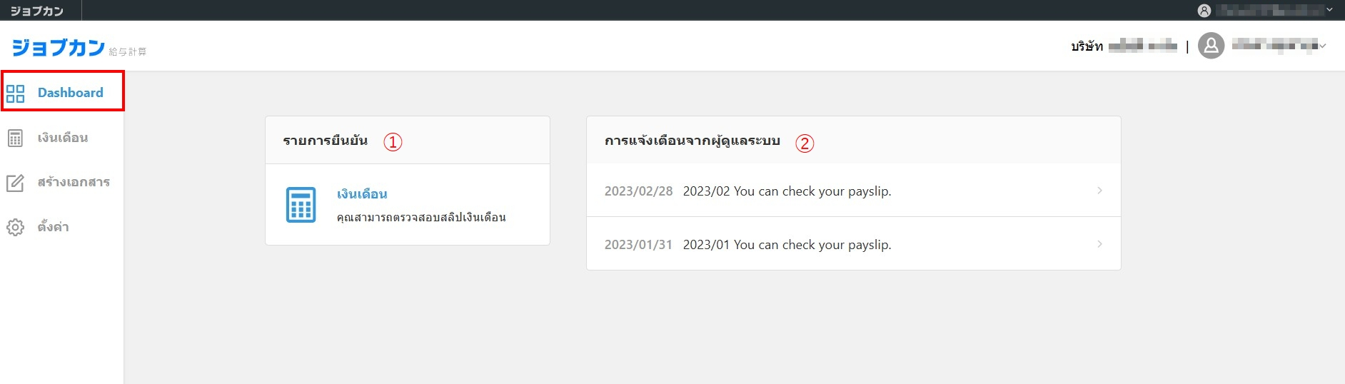 | 2 | "การแจ้งเตือนจากผู้ดูแลระบบ" จะแสดงการแจ้งเตือนจากทางผู้ดูแลระบบ คลิกการแจ้งเตือนเพื่อดูสลิปเงินเดือนหรือรายละเอียดอื่น ๆ ได้ |