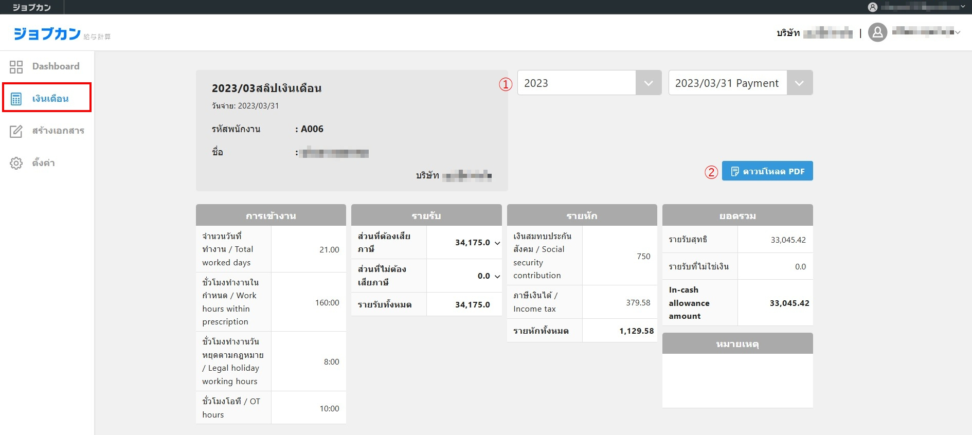 | 2 | คลิก "ดาวน์โหลด PDF" เพื่อพิมพ์หรือดาวน์โหลดสลิปเงินเดือนที่เลือก |