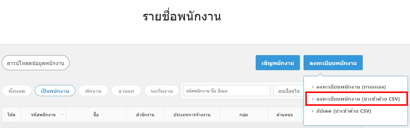 ลงทะเบียนข้อมูลพนักงานด้วยไฟล์ CSV