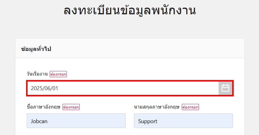 1. จากเมนู "รายชื่อพนักงาน" ที่อยู่ทางด้านซ้ายของหน้าจอ และคลิก "ลงทะเบียนพนักงาน" หรือคลิกแก้ไขพนักงานที่เกี่ยวข้อง แล้วกำหนดวันที่เข้าทำงานในอนาคตในช่อง "วันที่เข้าทำงาน" แล้วบันทึกข้อมูล