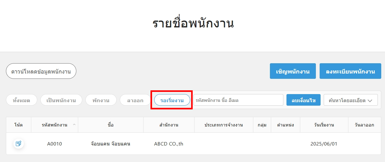 2. ในหน้าจอ "รายชื่อพนักงาน" เมื่อเลือก "รอเริ่มงาน" จะสามารถตรวจสอบได้ว่าพนักงานนั้นได้รับการลงทะเบียนเป็น "รอเริ่มงาน" แล้ว