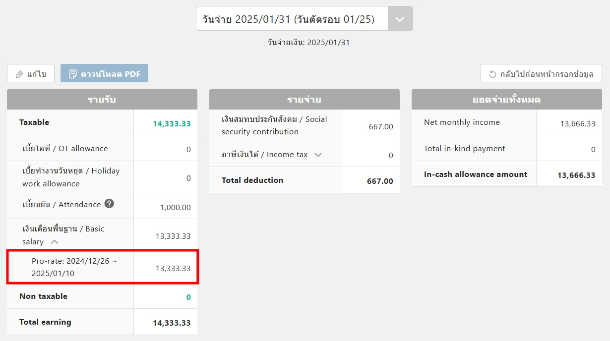 ฟีเจอร์นี้ช่วยคำนวณเงินเดือนตามวันที่ทำงานจริง โดยเฉพาะในกรณีพนักงานเริ่มงาน / สิ้นสุดงานกลางเดือนหรือไม่เต็มเดือน ทำให้ฝ่ายบุคคลสามารถคำนวณเงินเดือนได้อย่างถูกต้องและยุติธรรม